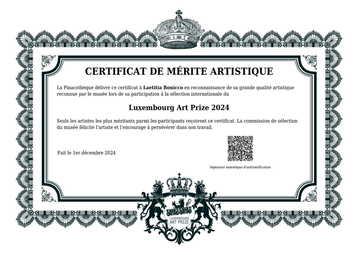 Le Certificat 2024 de mérite artistique qui m’a été décerné lors de ma participation au Luxembourg Art Prize